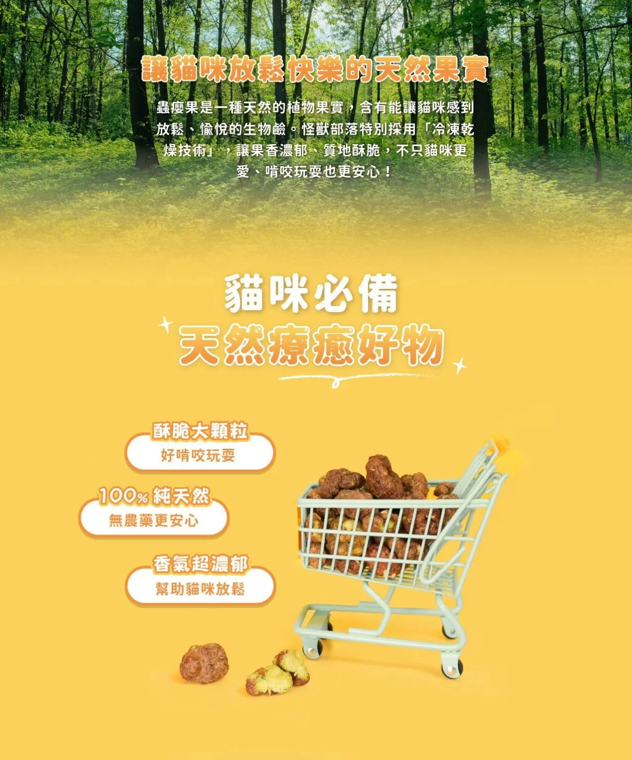 怪獸凍乾蟲癭果由天然植物果實製成,黏液為果實本身的汁液,果實綠綠的、果肉中帶點橘粉色都是正常的。果實為野生摘採無農藥,整顆都能食用,可以放心給貓咪啃咬、玩耍。