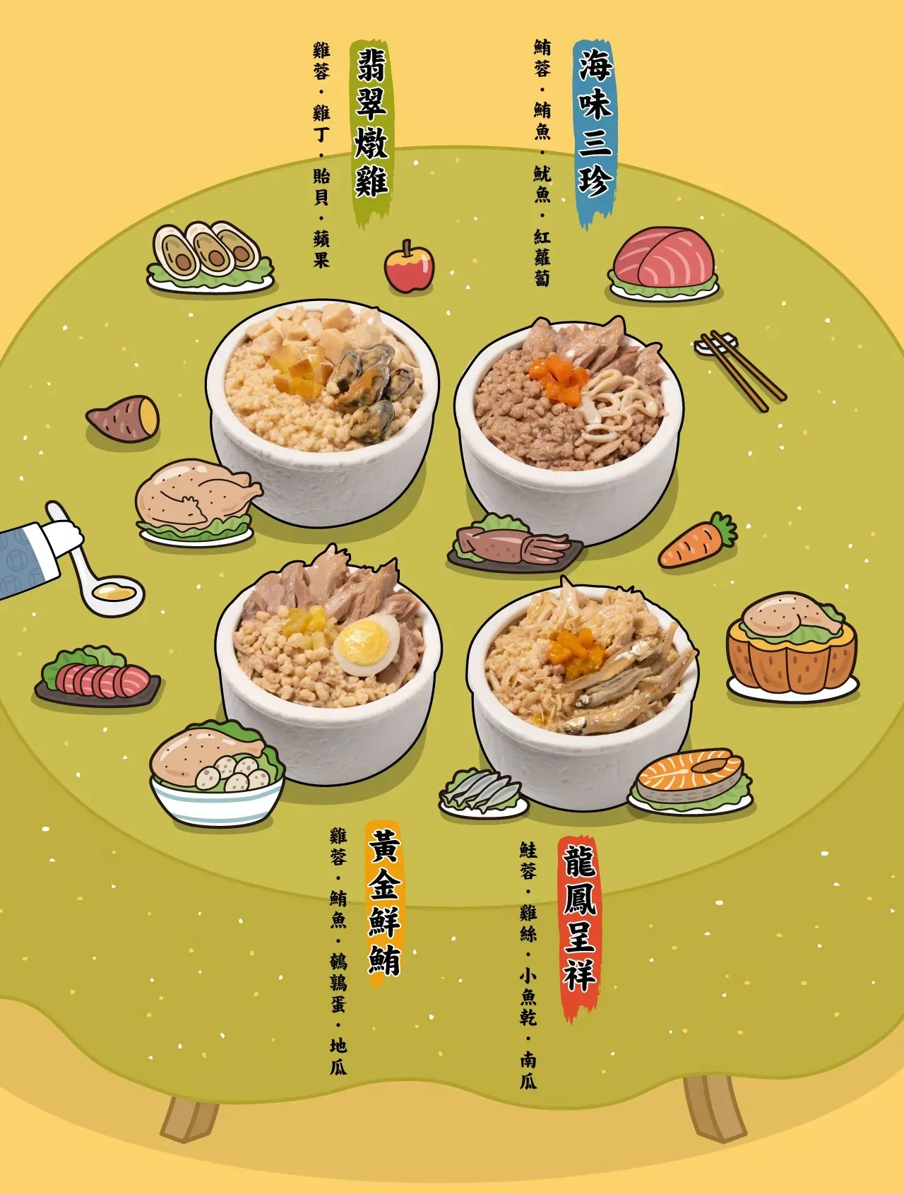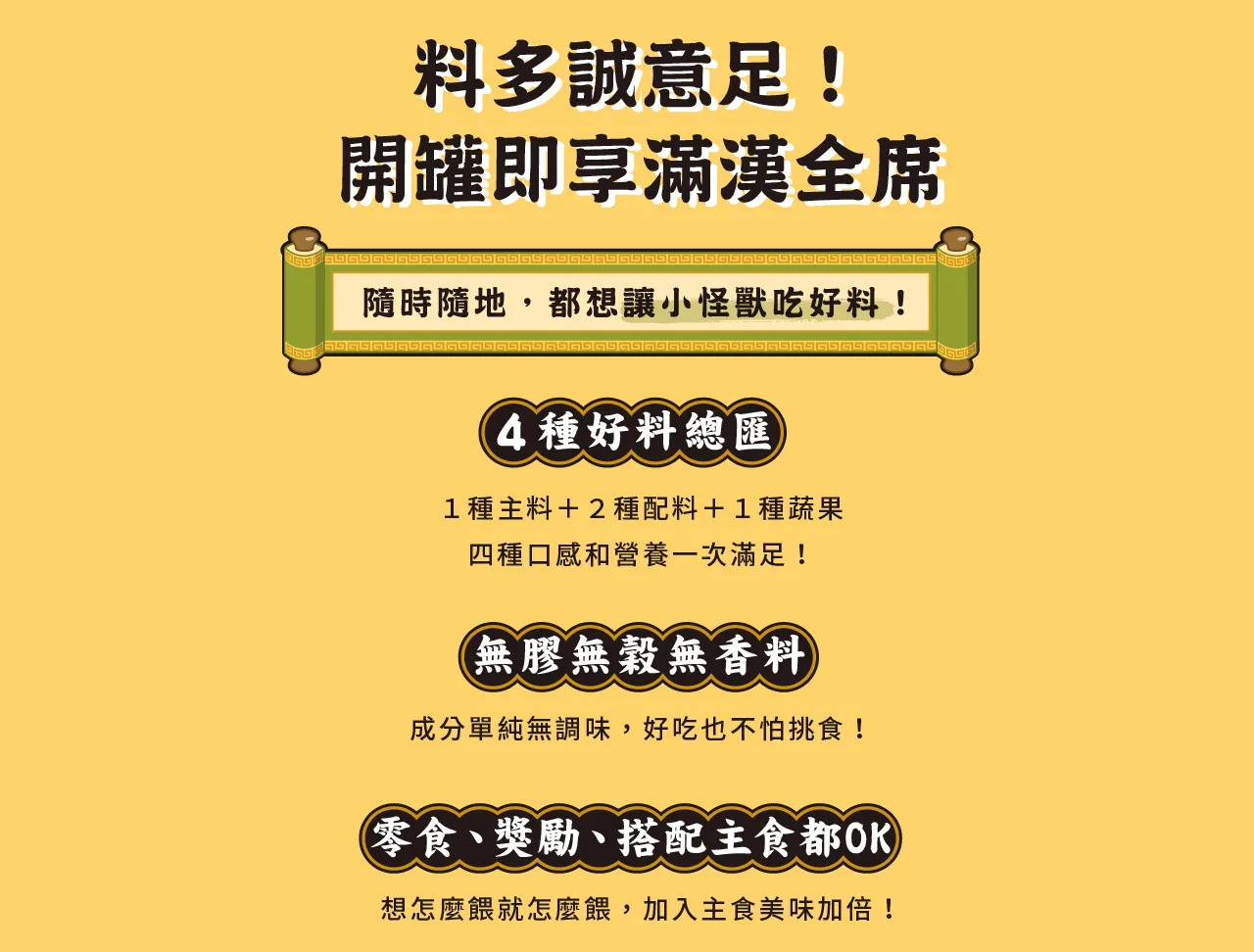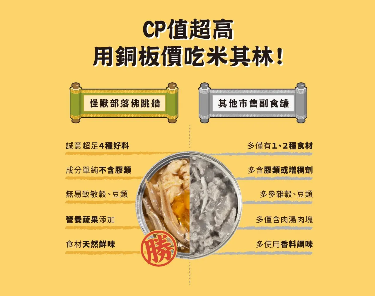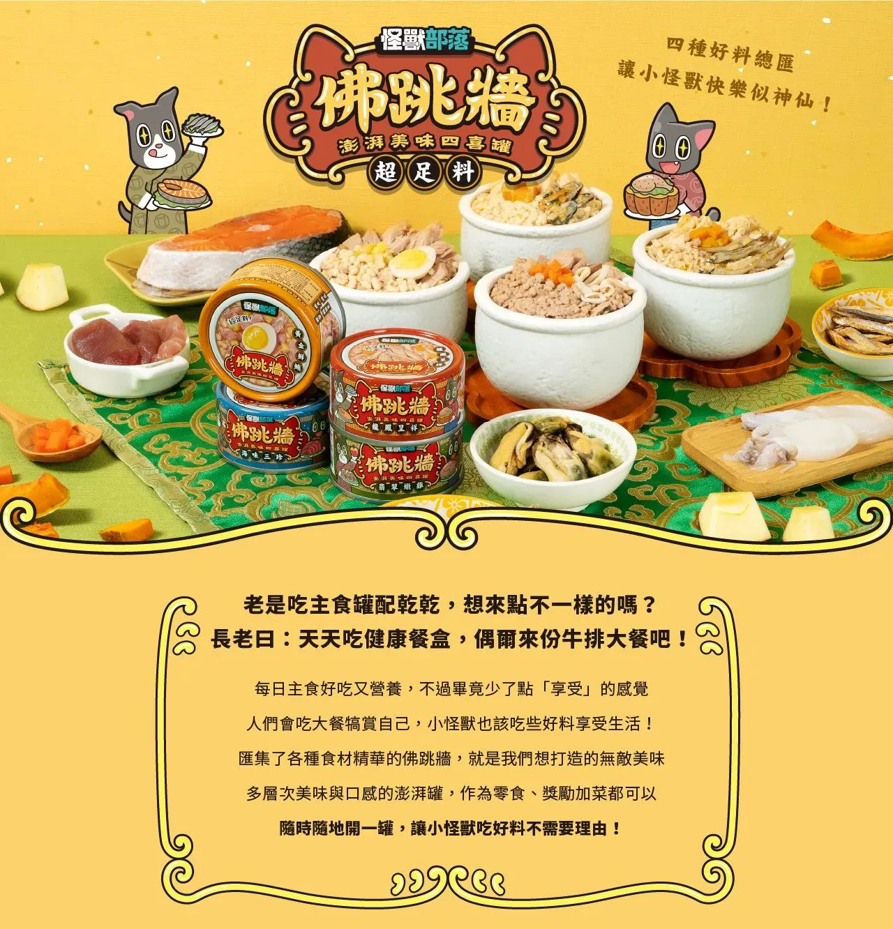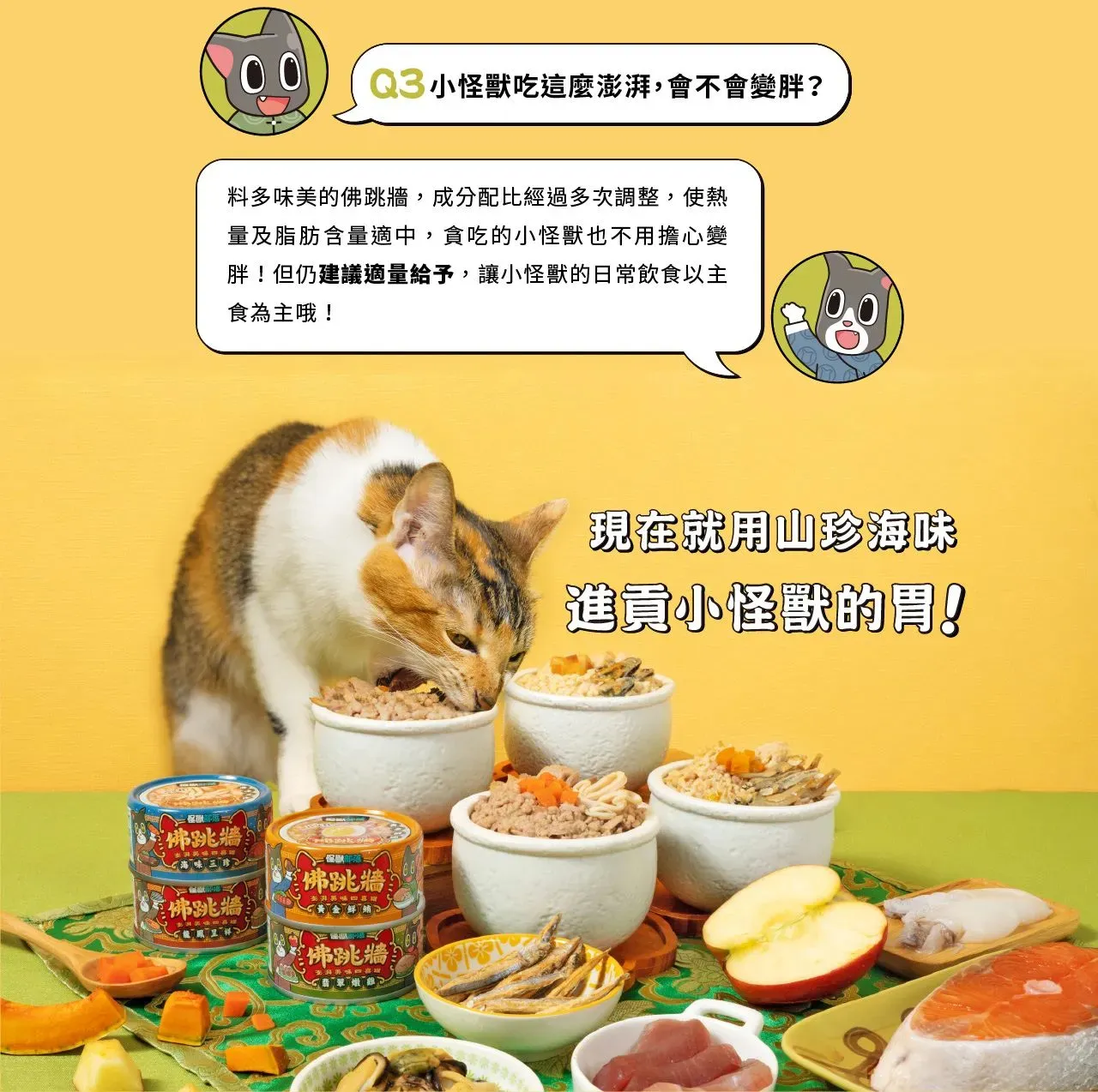 料多味美的佛跳牆,成分配比經過多次調整,使熱量及脂肪含量適中,貪吃的小怪獸也不用擔心變胖!但仍建議適量給予,讓小怪獸的日常飲食以主食為主哦!