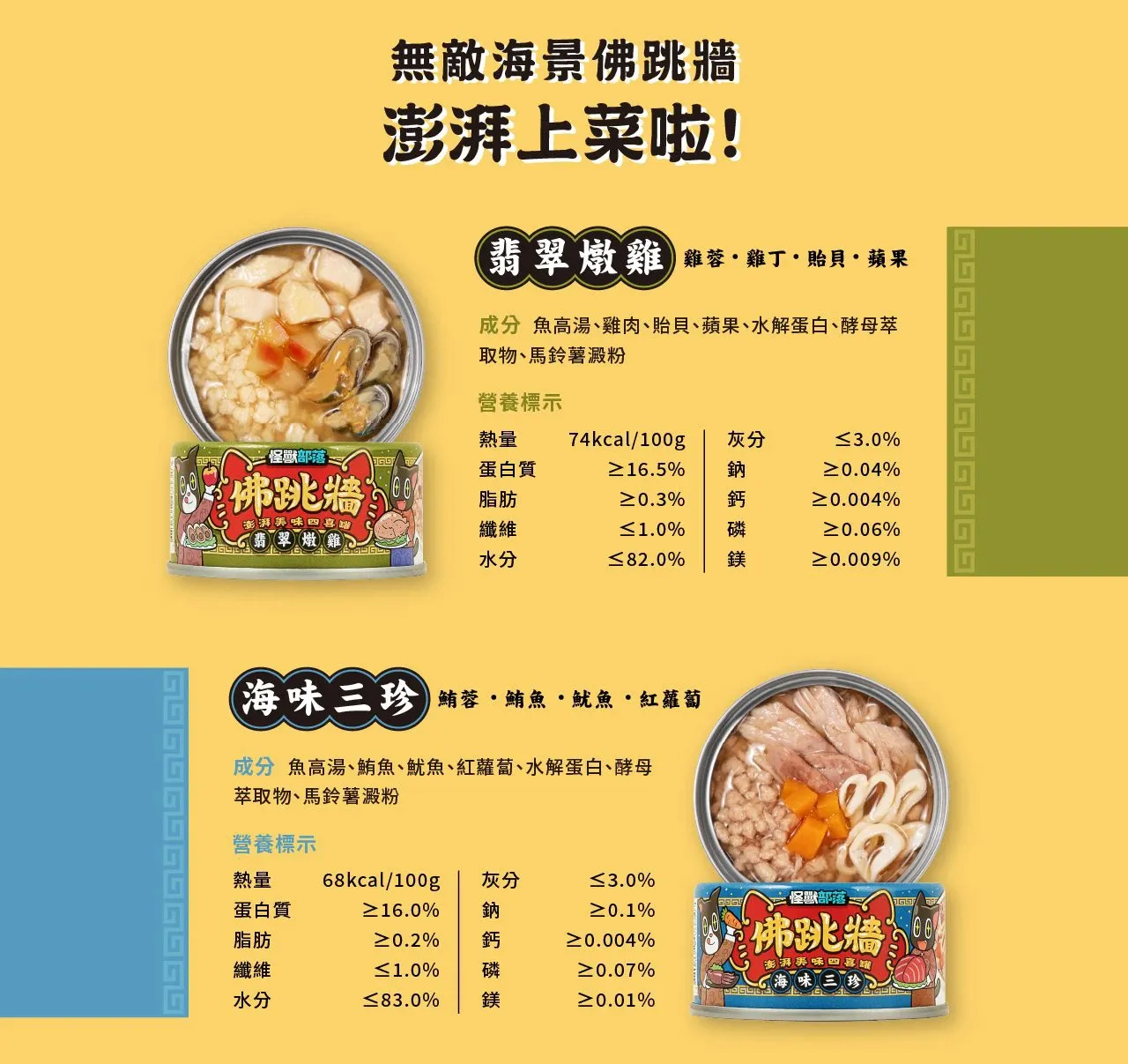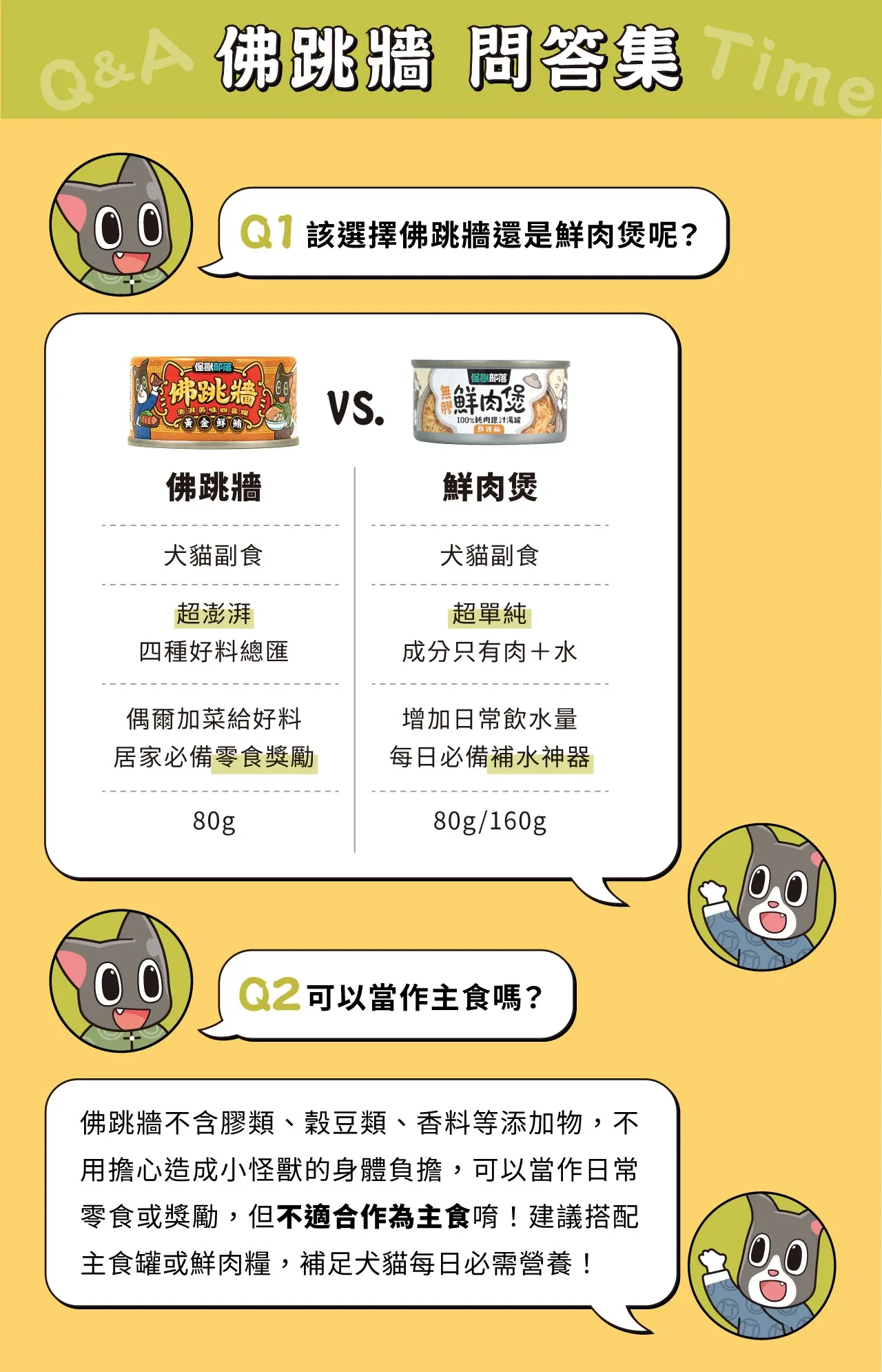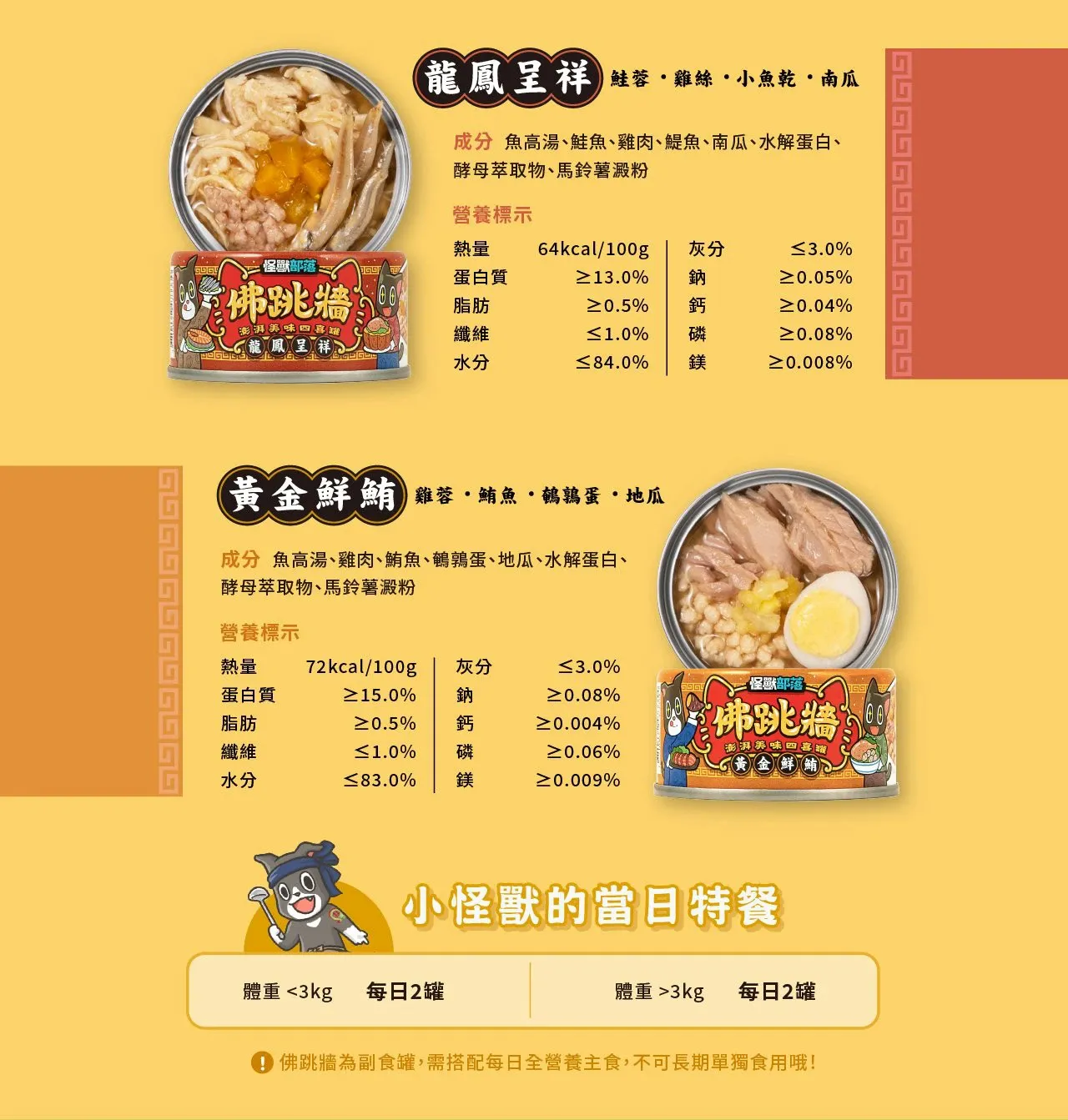 佛跳牆不含類、豆類、香料等添加物,不用擔心造成小怪獸的身體負擔,可以當作日常零食或獎勵,但不適合作為主食!建議搭配主食罐或鮮肉糧,補足犬貓每日必需營養!