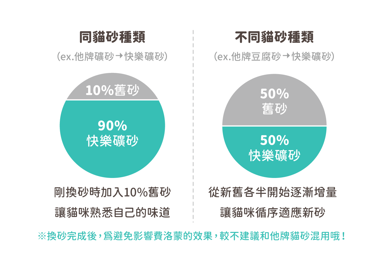 慢慢來,別太急! 新舊貓砂以 7(舊):3(新) → 5:5 → 3(舊):7(新) 逐步混合,讓貓咪有適應時間。