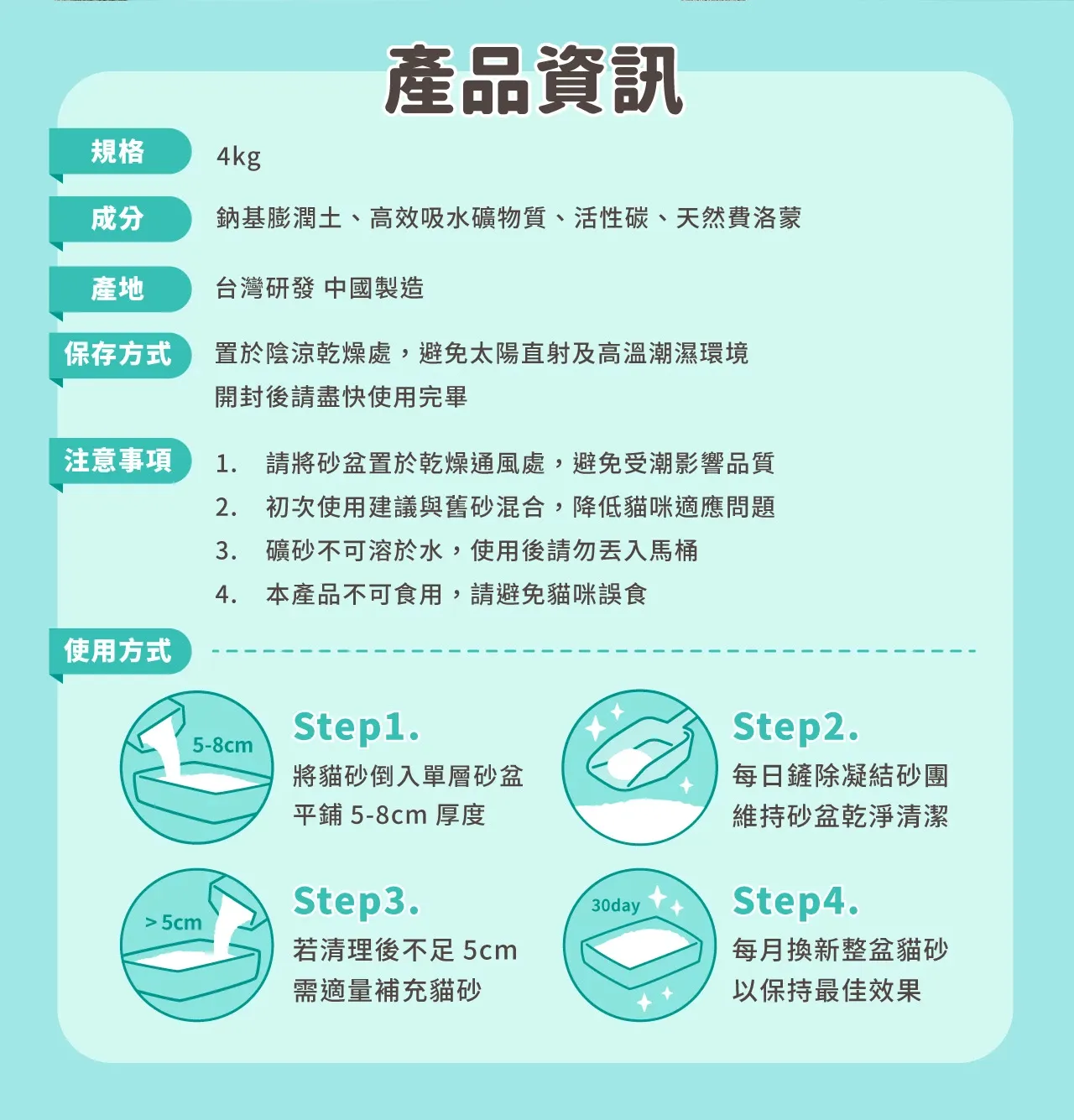 重量較重:比其他類型的貓砂更重,搬運時較費力,建議選擇4kg 小包裝或使用宅配服務。