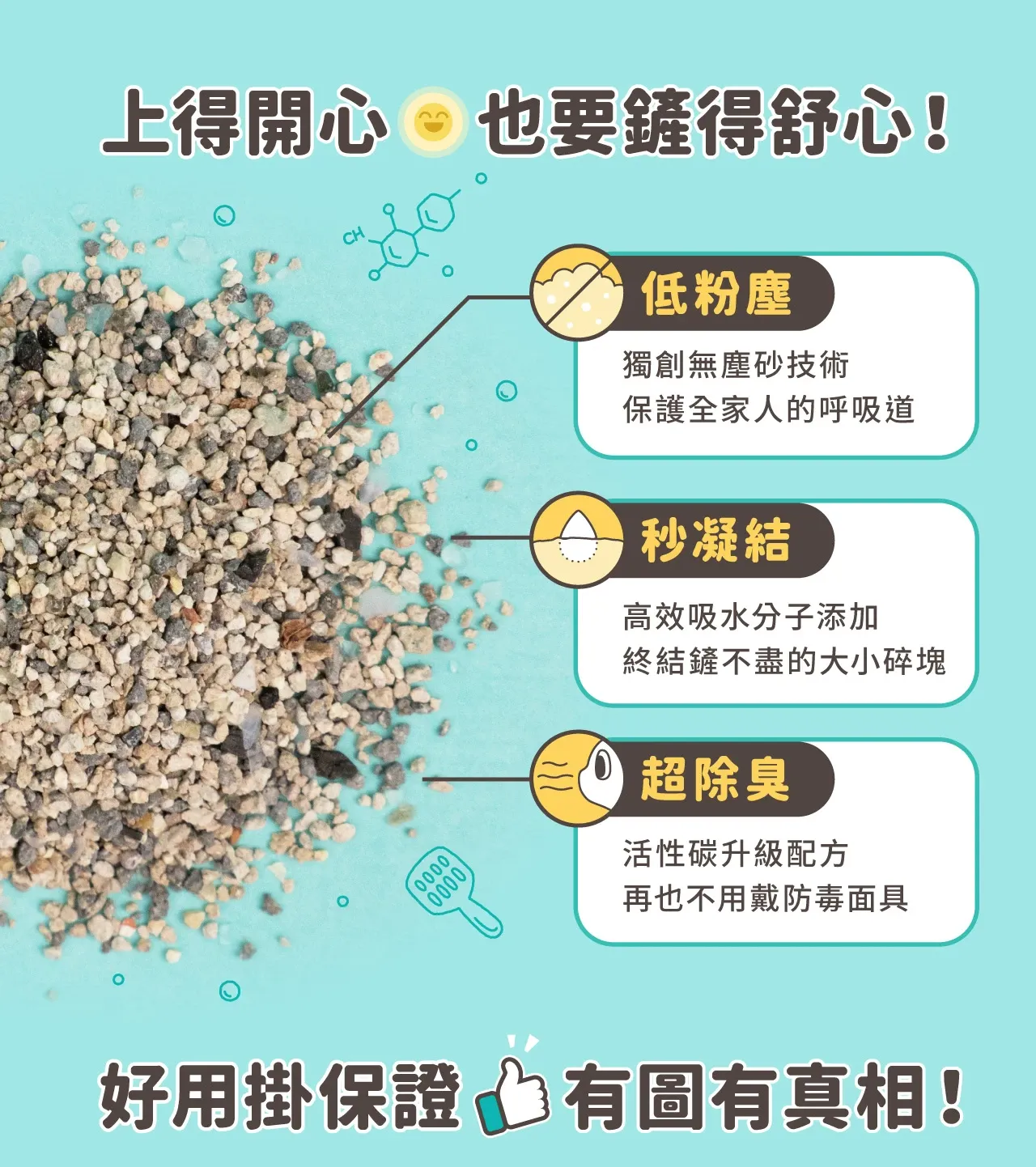 添加活性碳+天然礦物除臭劑,能吸附異味分子,24小時長效抑臭,維持空氣清新,讓貓咪與你都住得舒適!