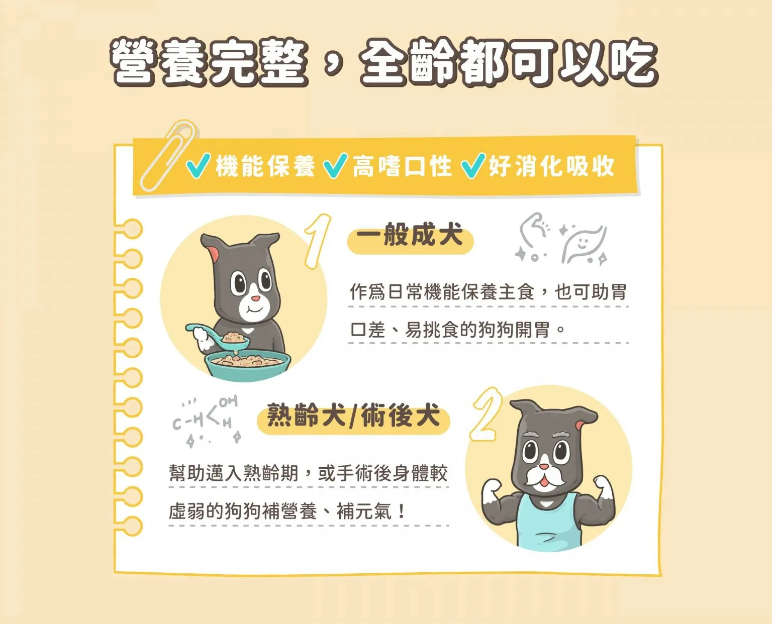 A 可以!機能罐依據AAFCO/NRC成幼犬營養標準設計,所有性別年齡的狗狗都可以吃唷!