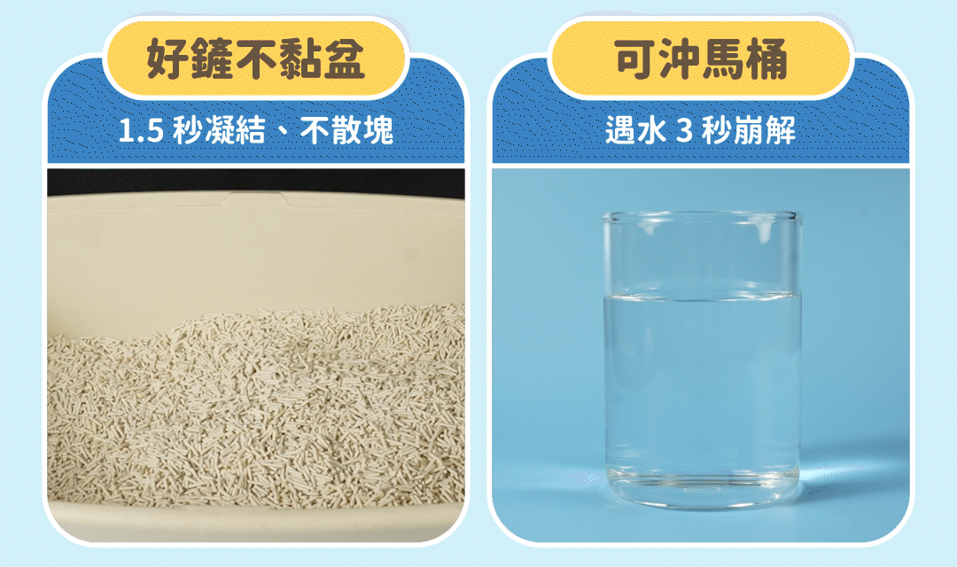 ※ 本產品為條型凝結砂,需搭配稍大孔徑貓砂鏟及單層貓砂盆使用。