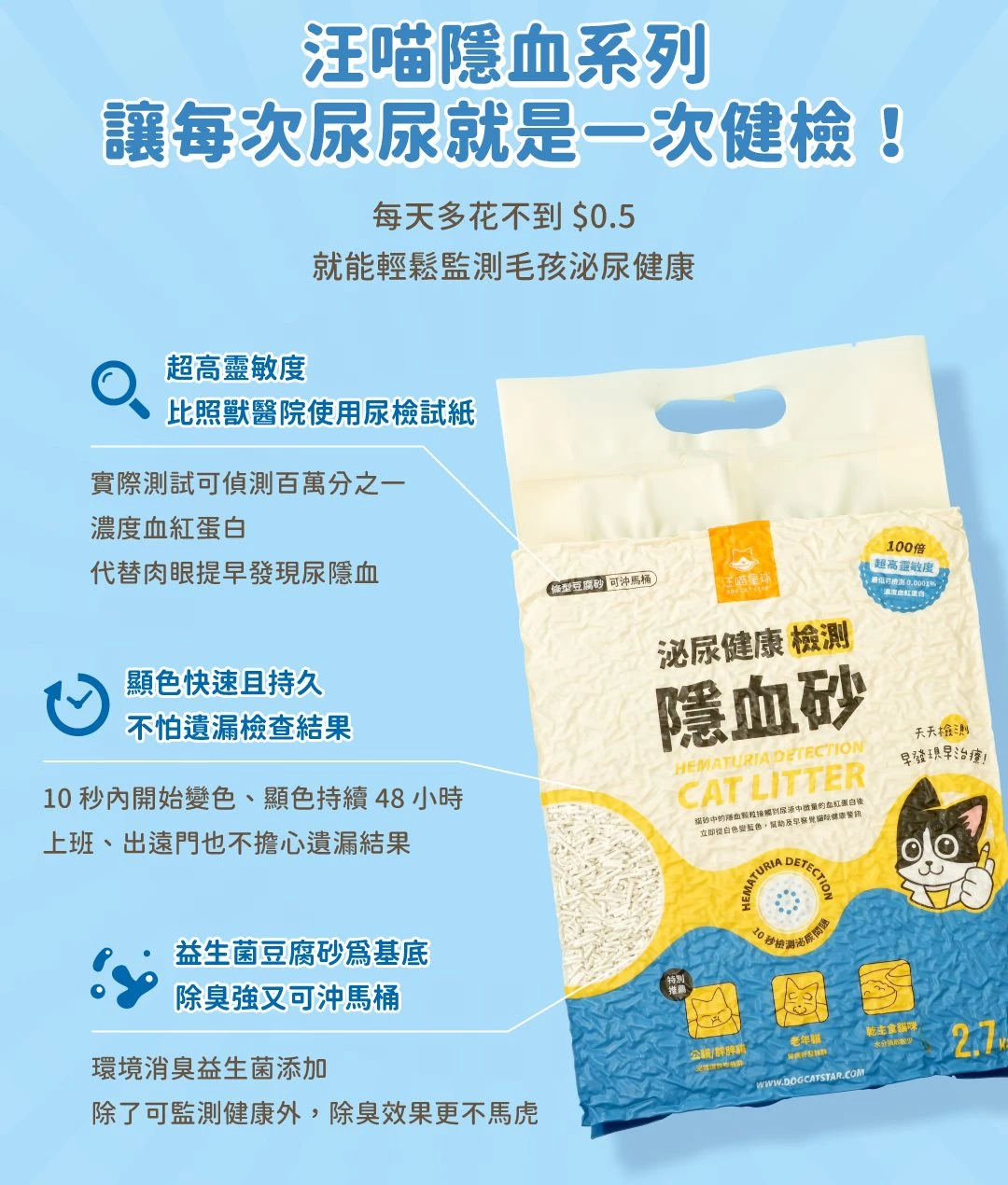 隱血顆粒的基底與豆腐砂類似,因此毛孩平時尿尿,顆粒都可以快速吸收尿液做判讀,毛拔麻們可以放心使用。