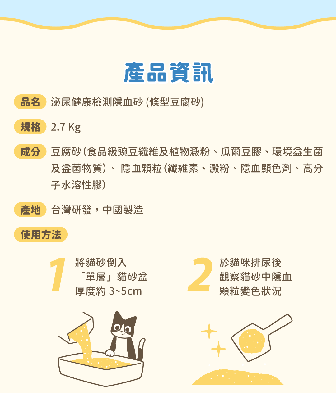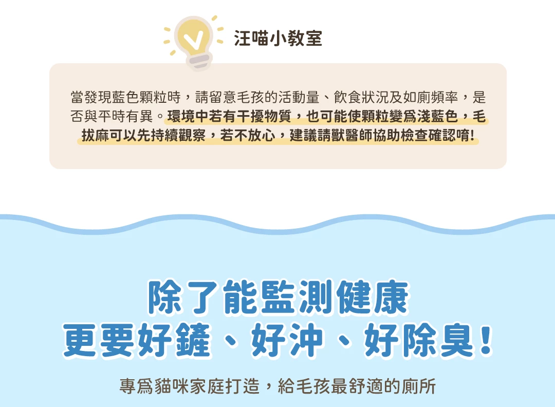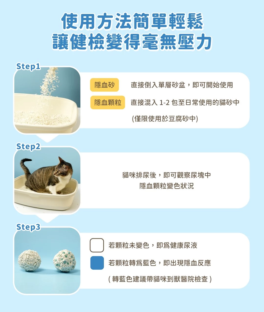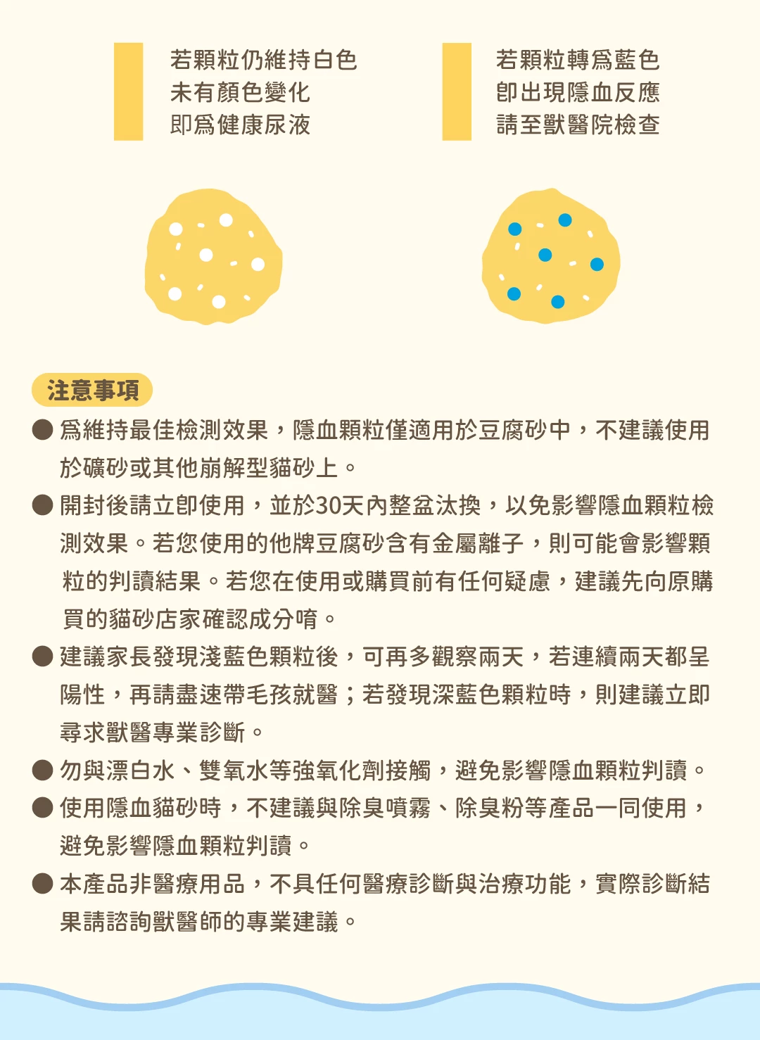 ※ 使用隱血貓砂時,不建議與除臭噴霧、除臭粉等產品一同使用,避免影響隱血顆粒判讀。