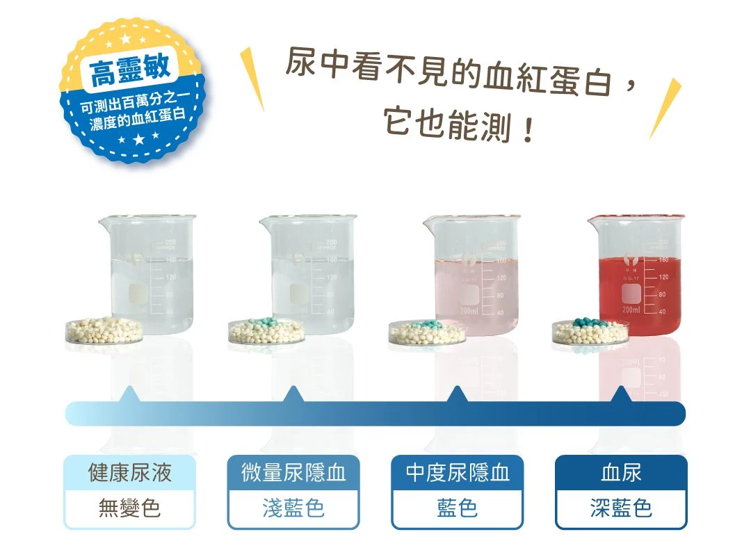 • 高靈敏度,10 秒測出眼睛看不到的血尿