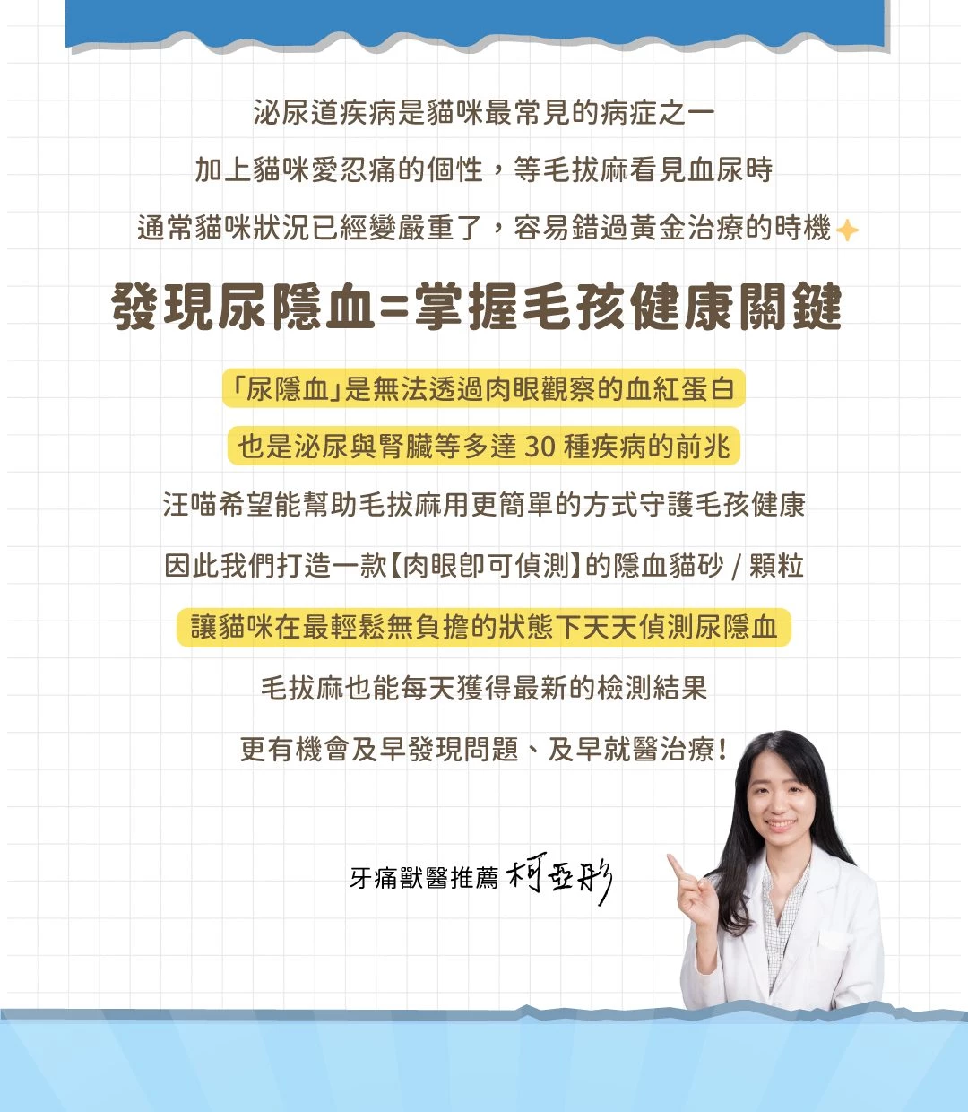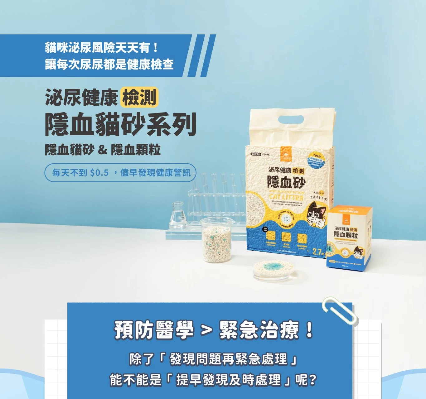 定期健檢對毛孩至關重要,這能夠有效地了解貓咪的健康狀況·但由於每次健檢間隔期間較長,因此還是非常建議飼主,除定期健檢外,日常也可以使用隱血砂唷,讓貓咪24小時隨時都可輕鬆接受尿液檢測。