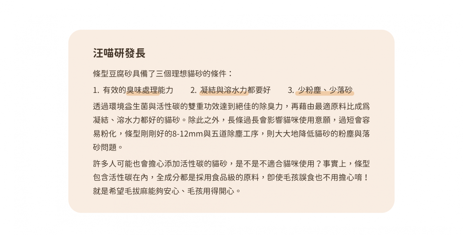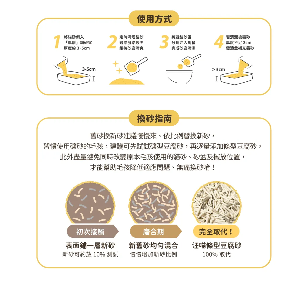 ※ 豆腐砂開封後容易受潮,開封後請存放於陰涼乾燥處,並盡速使用完畢,避免影響貓砂品質。