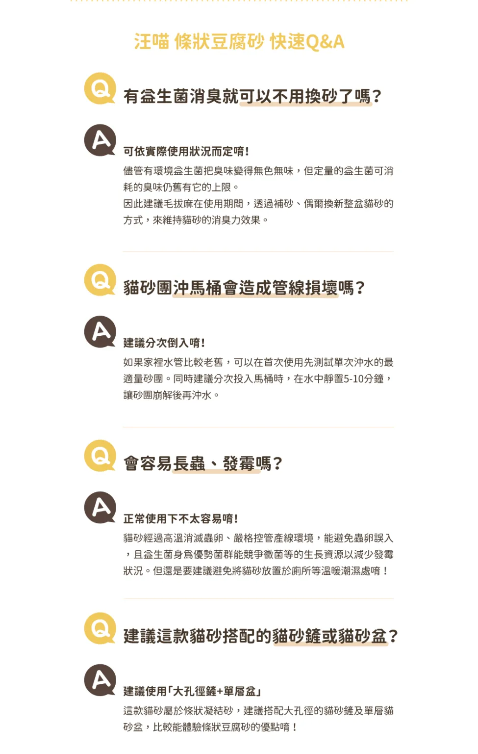 ※ 本產品為條型凝結砂,需搭配稍大孔徑貓砂鏟及單層貓砂盆使用。