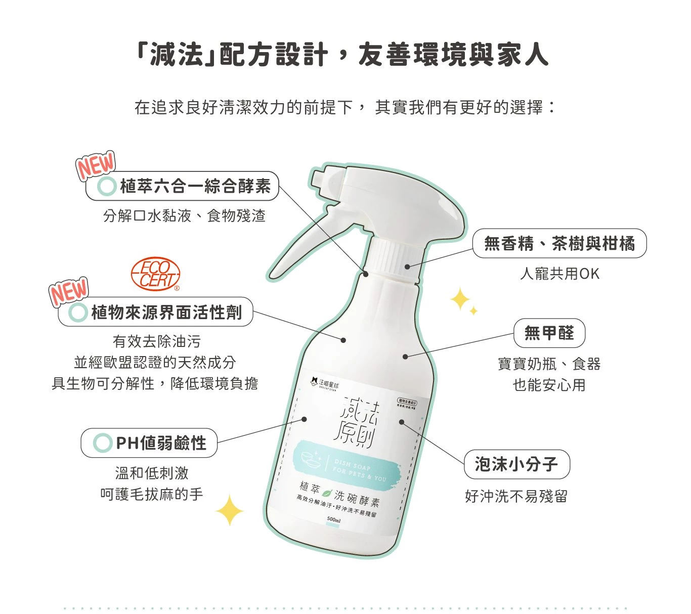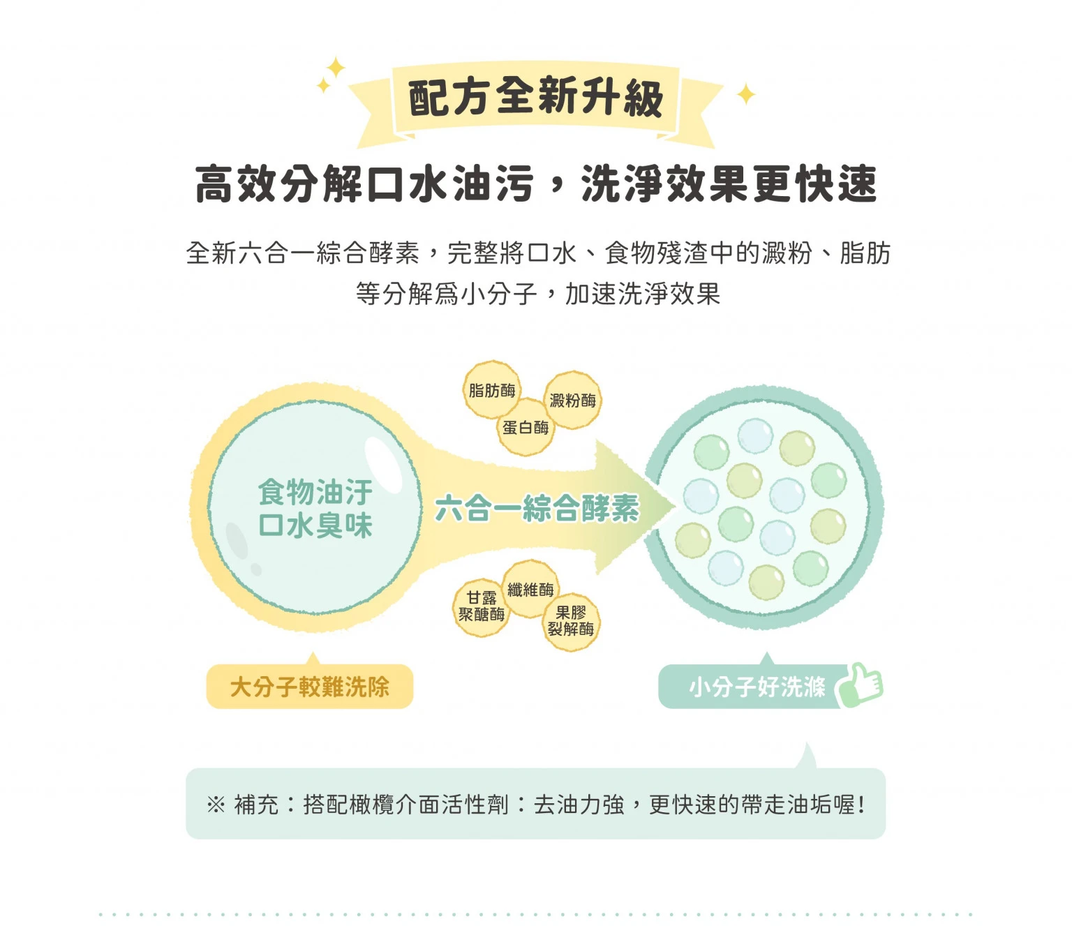 1. 新版配方含六合一綜合酵素,加速分解口水及食物中的脂肪、蛋白質、澱粉等;並新增「ECOCERT認證」天然成分的橄欖油界面活性劑,能快速帶走油垢,也因為此原料本身為黃色,因此新版的洗碗酵素顏色會呈現淡淡的黃色喔!