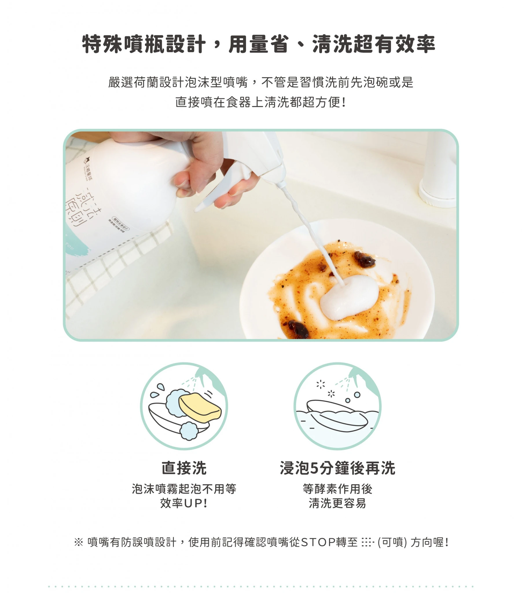 直接洗 浸泡5分鐘再洗 慕斯噴霧起泡不用等,效率up 等酵素作用後更好洗淨