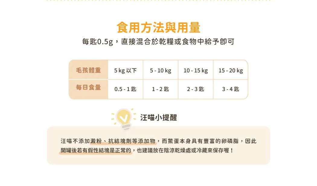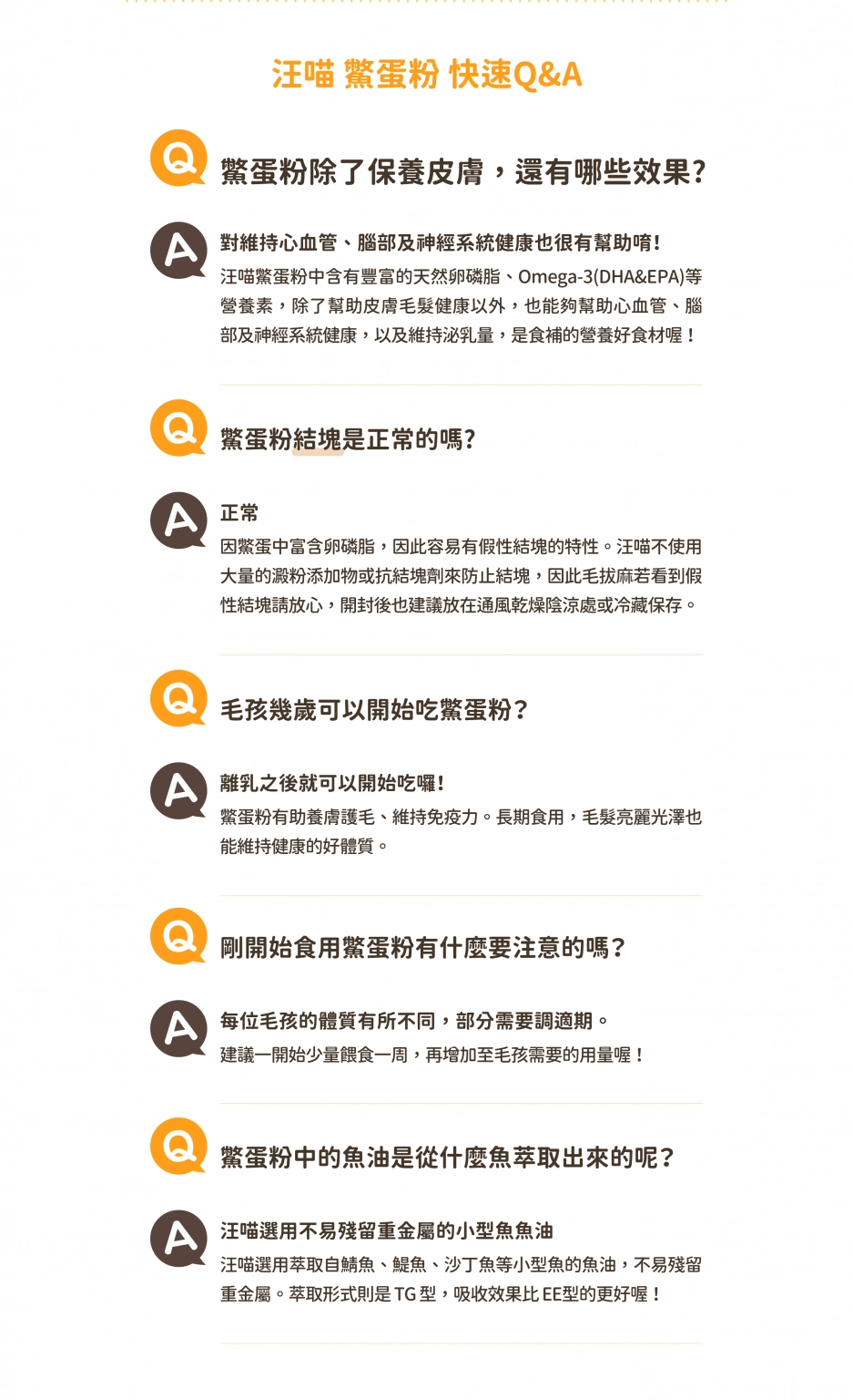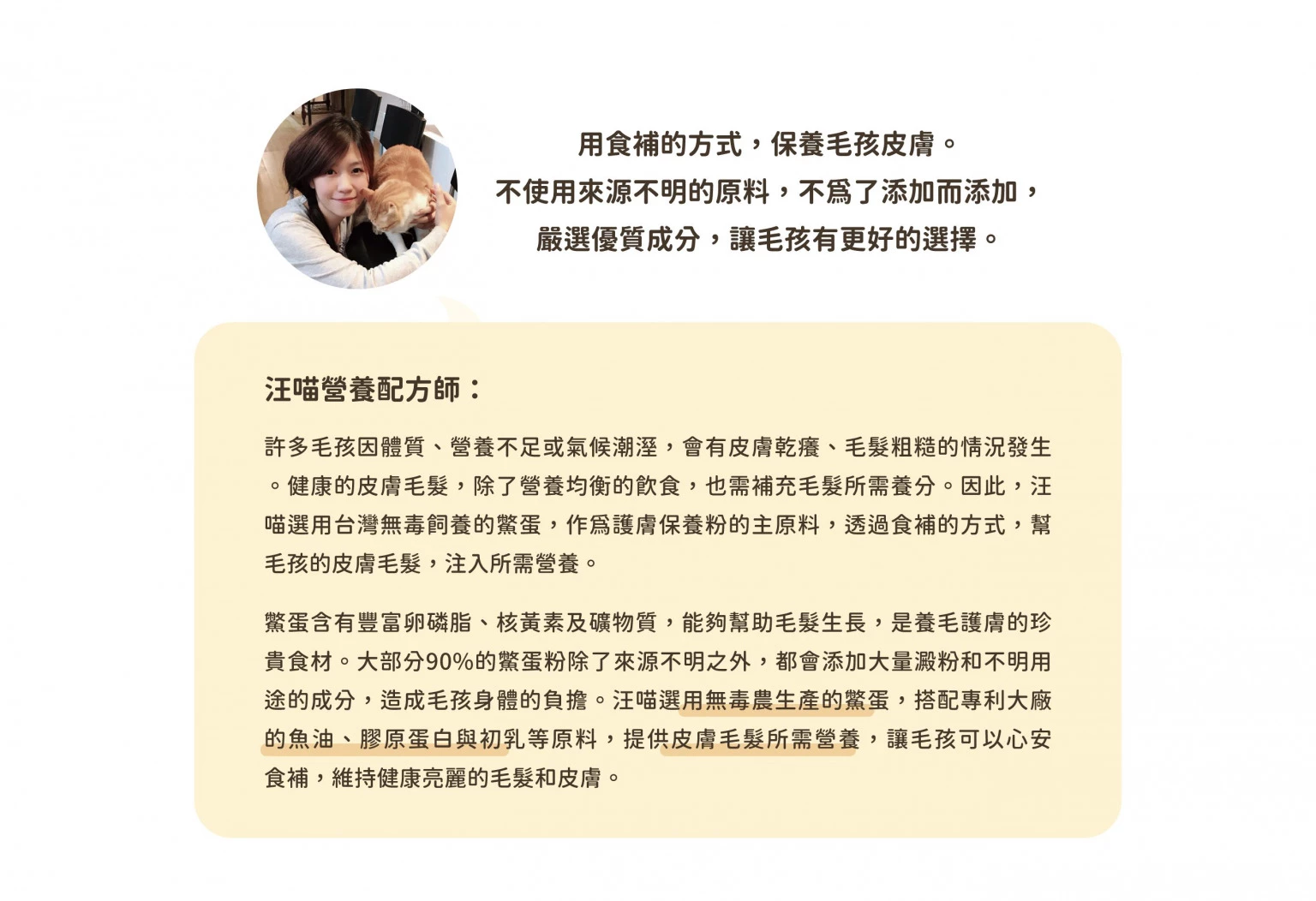 • 汪喵選用台灣無毒飼養鱉蛋,不添加澱粉,成分來源透明!