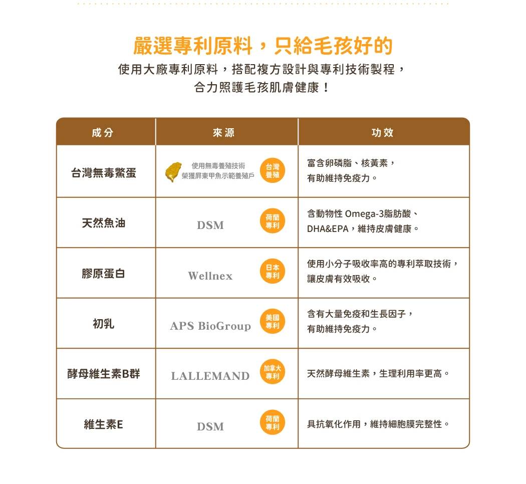• 天然鱉蛋 x 五大國際專利原料,讓毛孩皮膚健康、毛髮濃密。