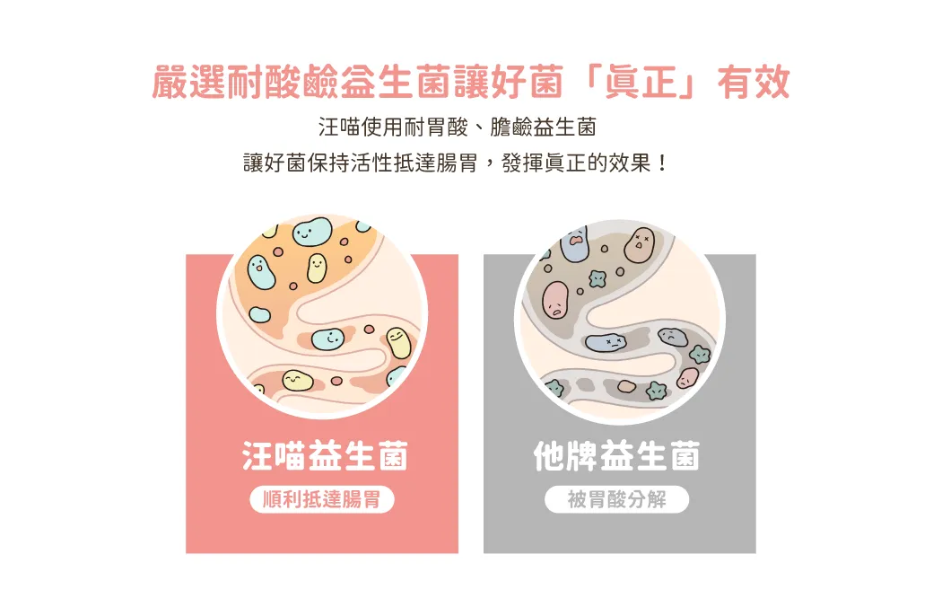 • 嚴選耐酸鹼、高定殖率及專利包埋益生菌種