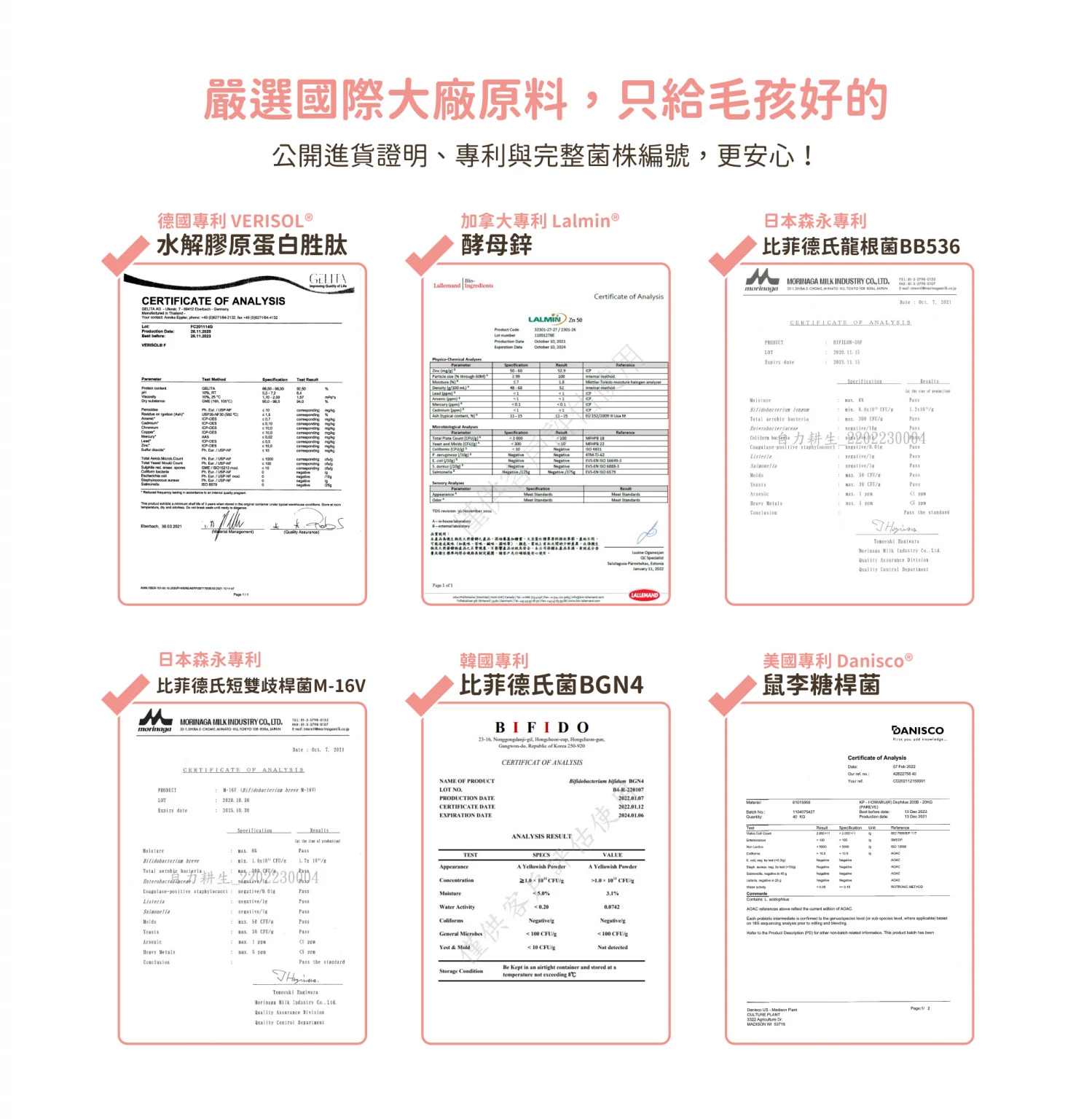 VERISOL ®魚水解膠原蛋白胜肽、β-1,3/1,6-葡聚糖、鼠李糖桿菌HN001、嗜酸乳桿菌NCFM、乳酸雙歧桿菌HN019、比菲德氏龍根菌BB536、比菲德氏短雙歧桿菌M-16V、植物乳酸桿菌LP28、比菲德氏菌BGN4、益源質LM-1004、Bimuno®半乳寡糖、LALMIN®酵母鋅、Oricera®神經醯胺、生物素、膳食纖維