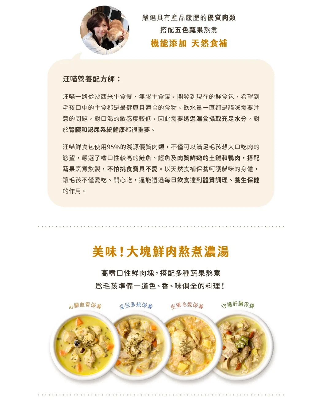 • 新鮮肉塊與肉絲+五色蔬果熬煮