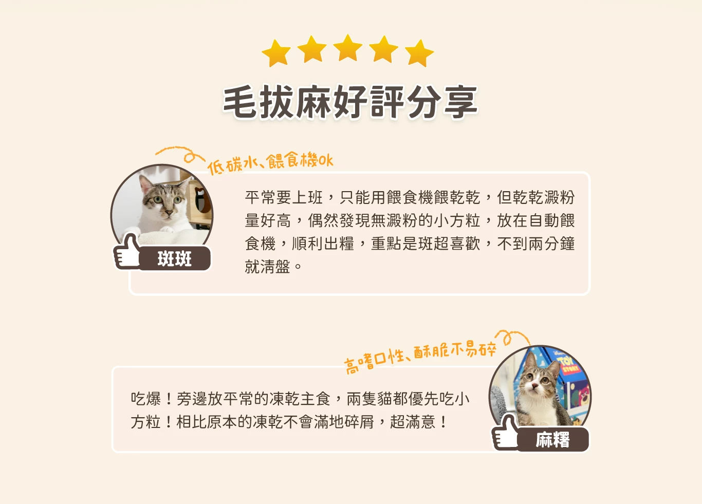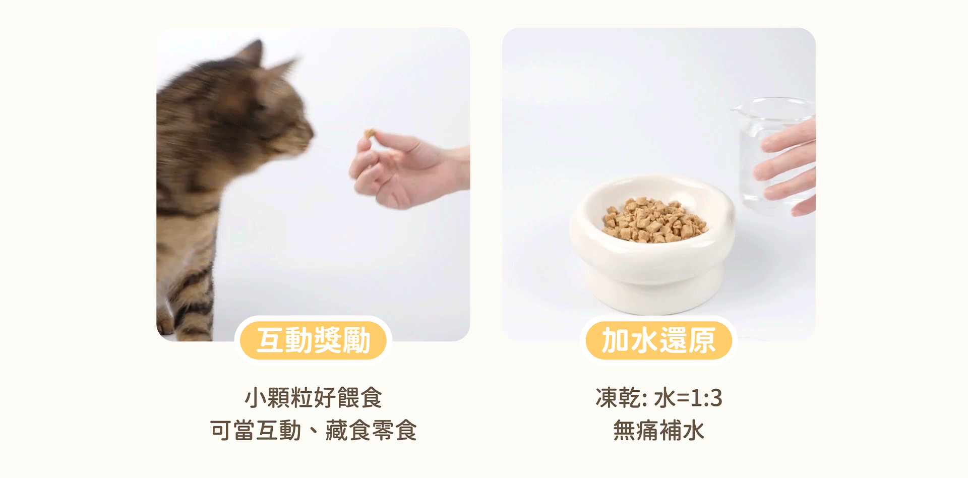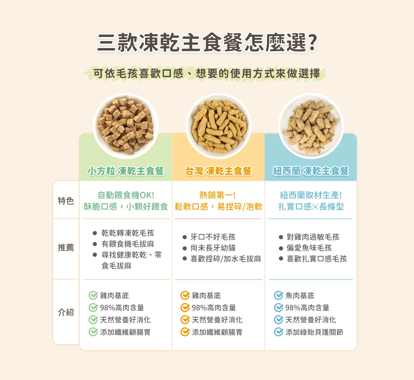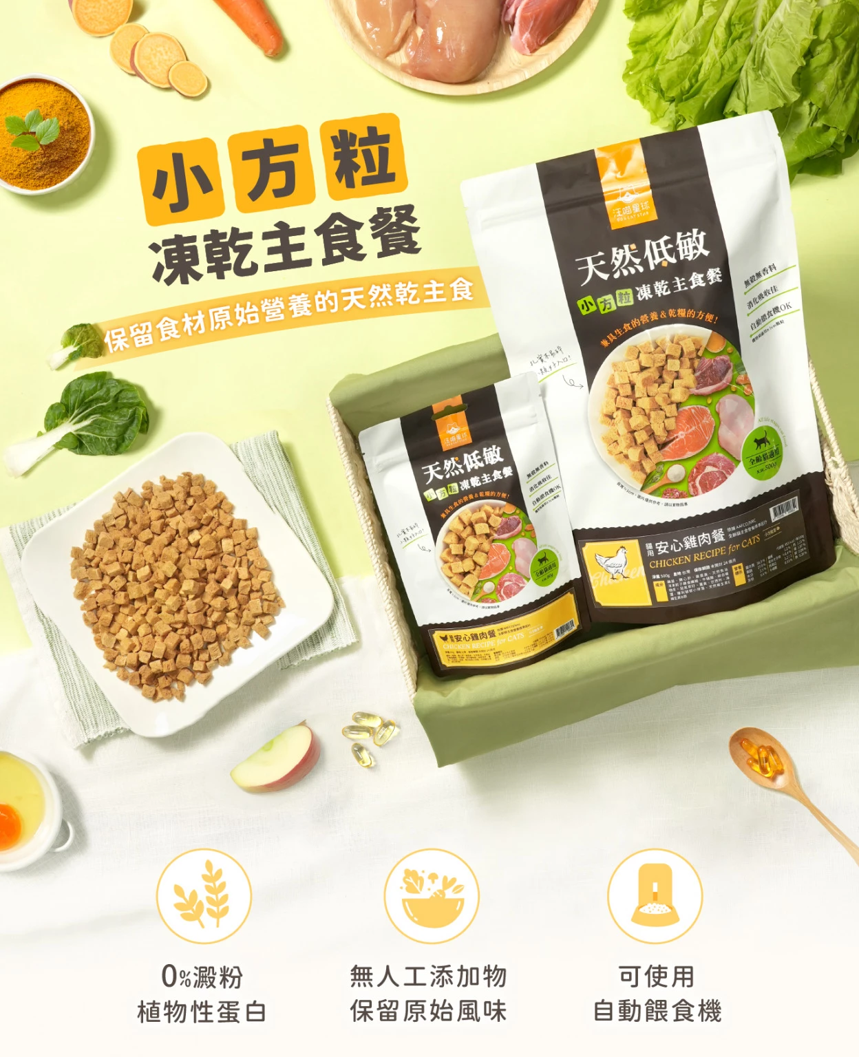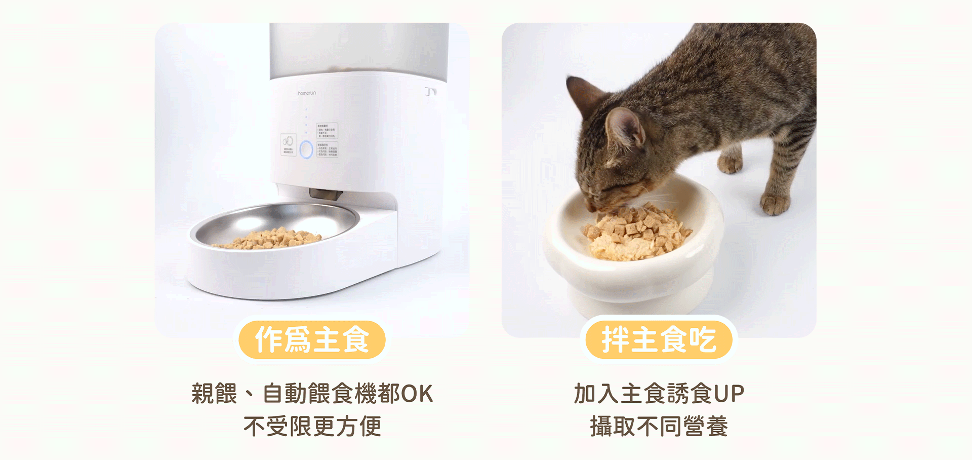 因使用冷凍乾燥技術保留營養,汪喵星球小方粒凍乾主食餐的孔隙較乾飼料大,受潮風險略高於乾飼料,建議毛爸媽們可以一次放少量至自動餵食機內,來減低受潮機率唷。