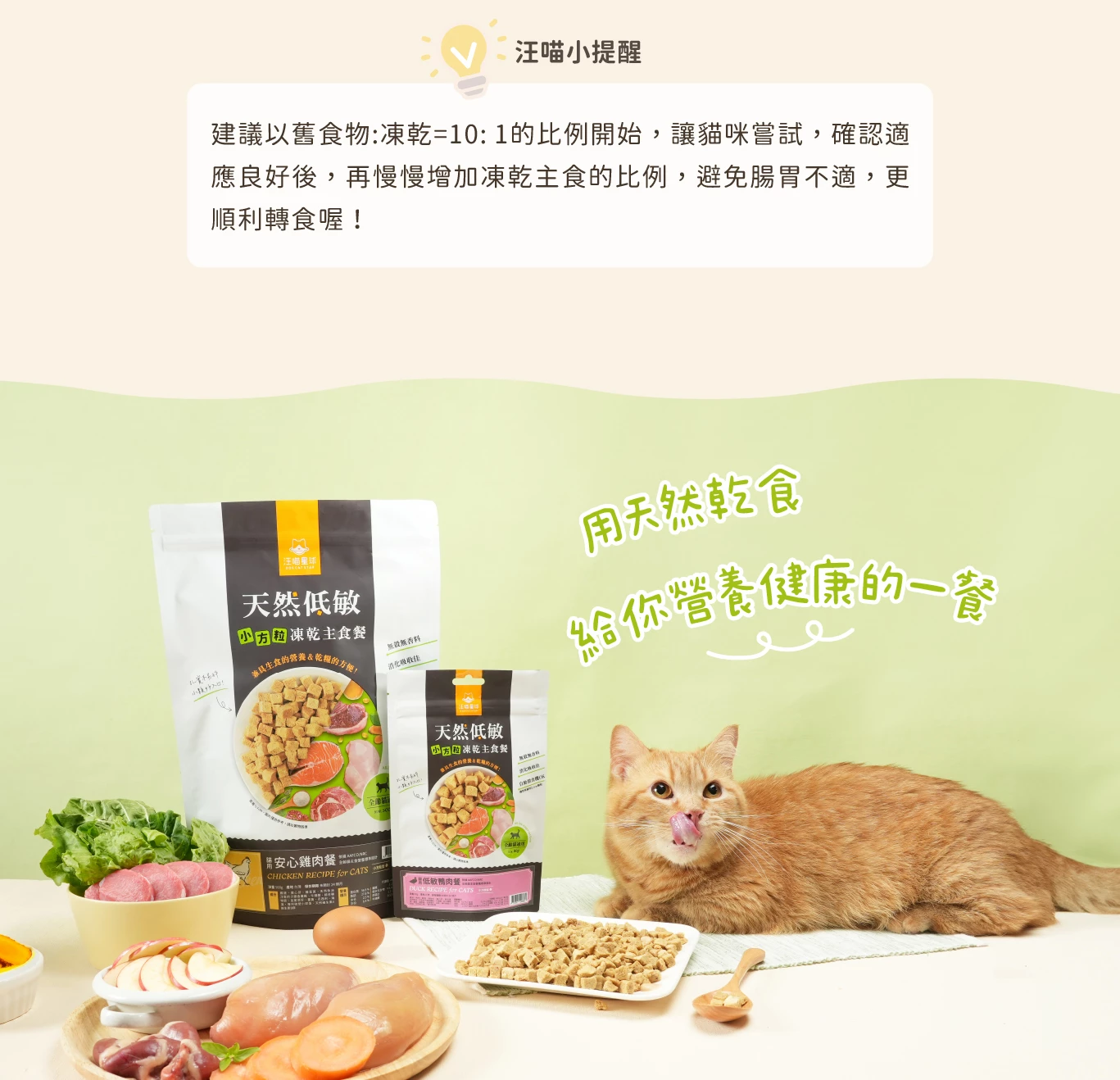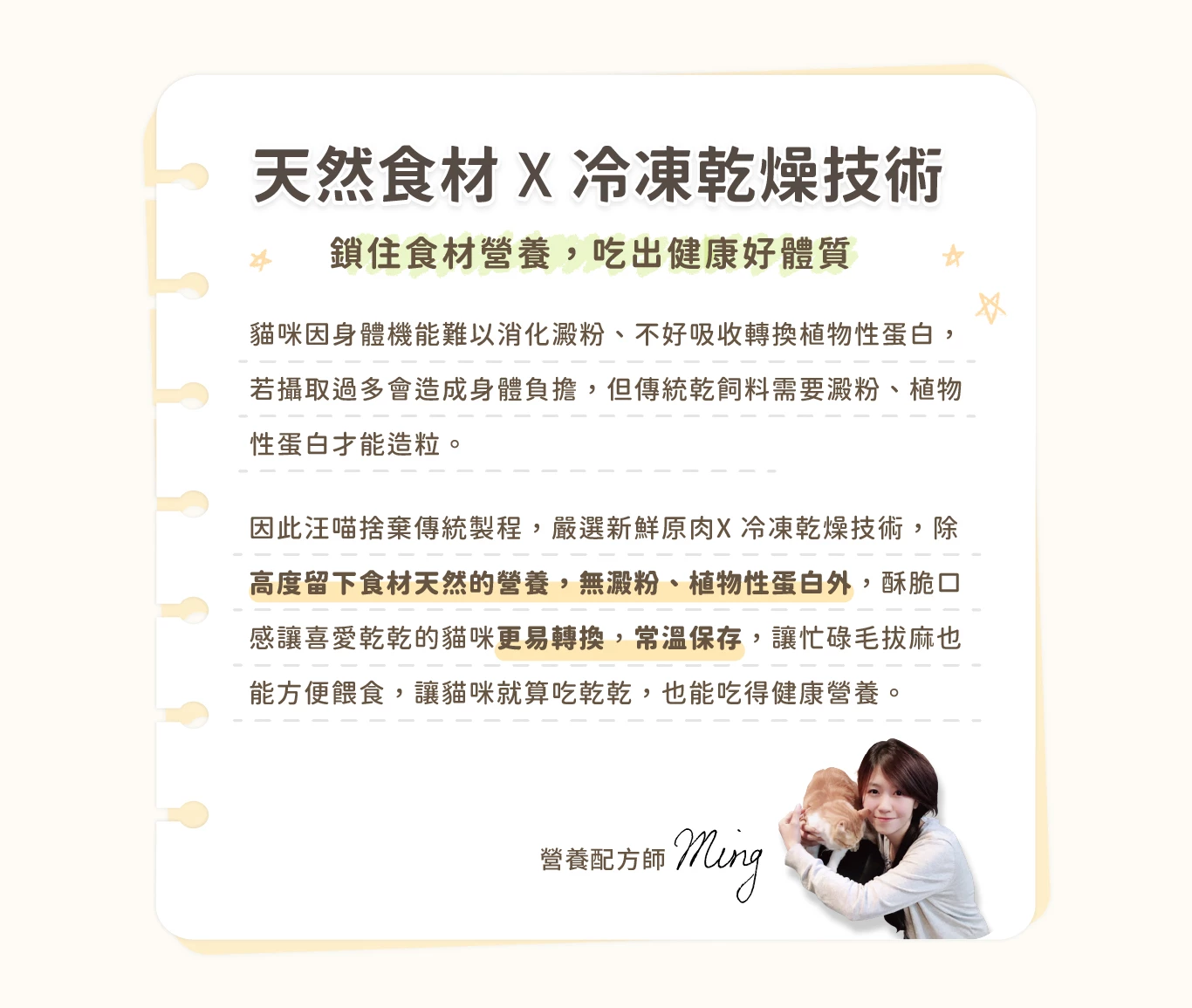 汪喵小方粒凍乾主食餐由於成分天然無添加防腐劑,開封後請儘快食用完畢。